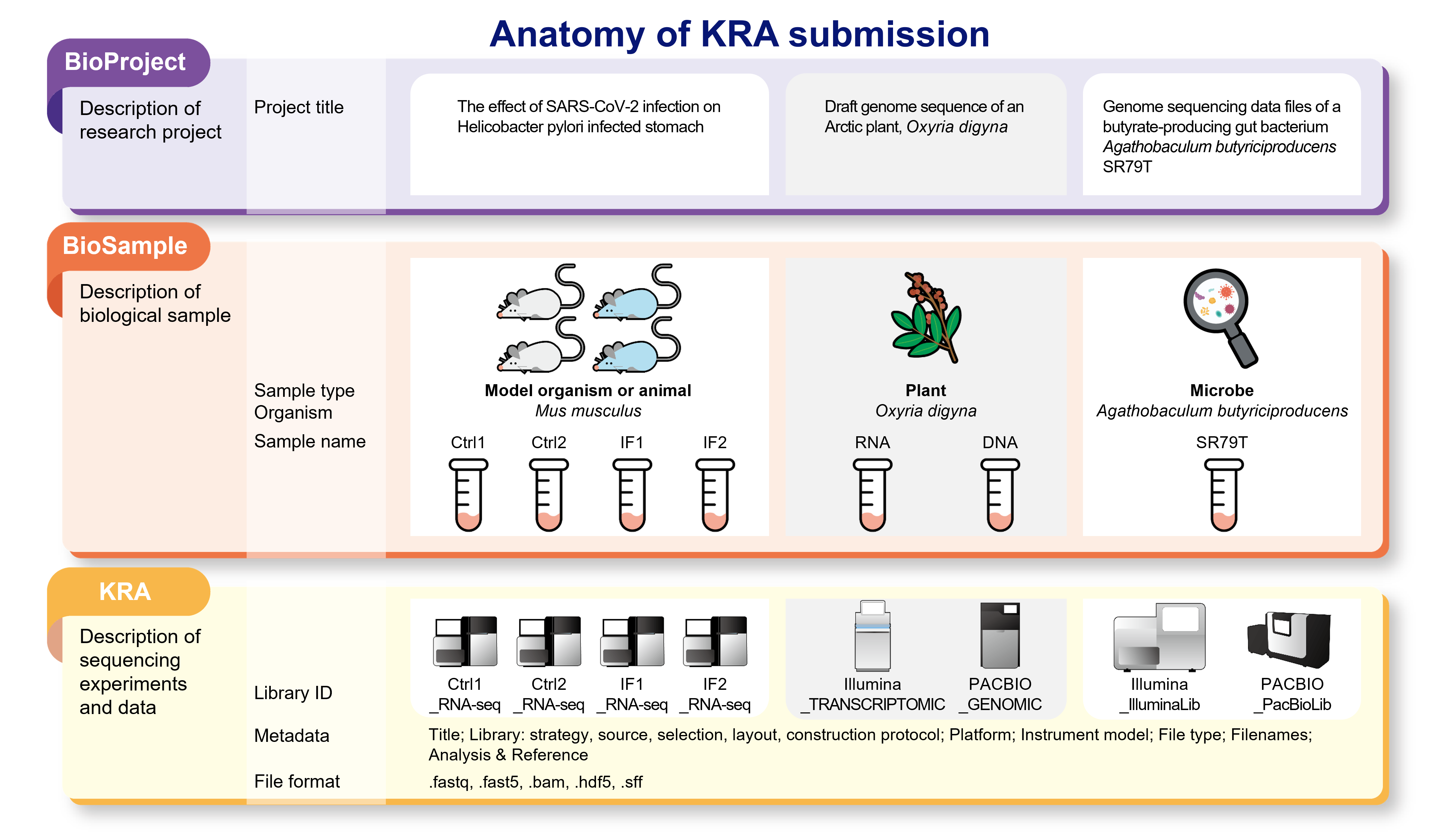 Organizational framework of the KRA data is based on the concepts of BioProject, BioSample, KRA (EXPERIMENT, RUN).
