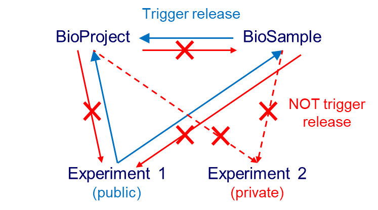 <figure><img src="https://2173271362-files.gitbook.io/~/files/v0/b/gitbook-x-prod.appspot.com/o/spaces%2F7yxS8L6oyg8lt6DC3l24%2Fuploads%2FERJf5yRXzcxjQPztuDE1%2Fimage.png?alt=media&#x26;token=9ec02879-10e9-4aee-85ae-5183e1f00d3d" alt=""><figcaption><p>Release of linked BioProject/BioSample/experimental data</p></figcaption></figure>