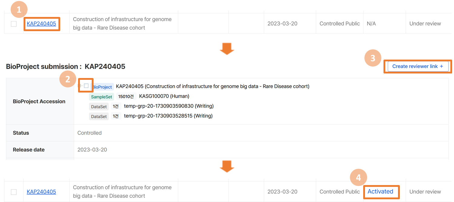 Linked [BioProject](https://kobic.gitbook.io/kra-docs/2.-how-to-submit/2.1-bioproject-and-biosample#bioproject-submissions-guideline), [BioSample](https://kobic.gitbook.io/kra-docs/2.-how-to-submit/2.1-bioproject-and-biosample#biosample-submission-quick-guide), and [KRA](https://kobic.gitbook.io/kra-docs/kra-user-guide/2.-how-to-submit/2.3-kra-metadata) data are released as follows.